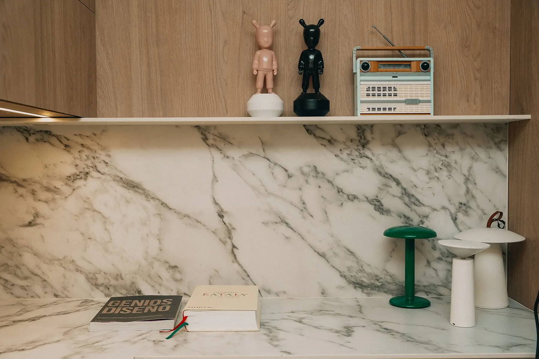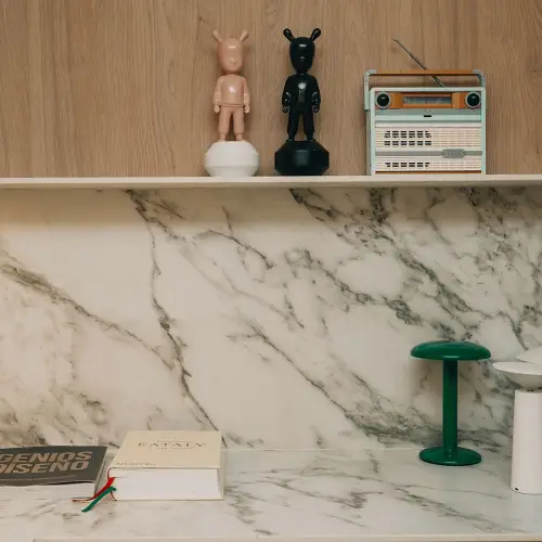 Un material que redefine la modernidad en los espacios. Su acabado brillante potencia la profundidad de sus vetas, donde los tonos neutros se entrelazan con matices cálidos y contrastes audaces, logrando una superficie sofisticada y atemporal.